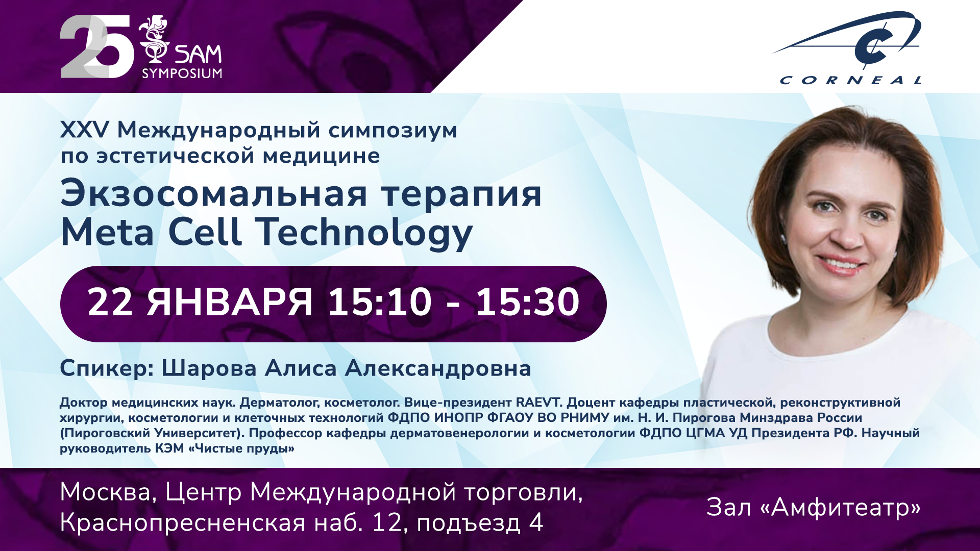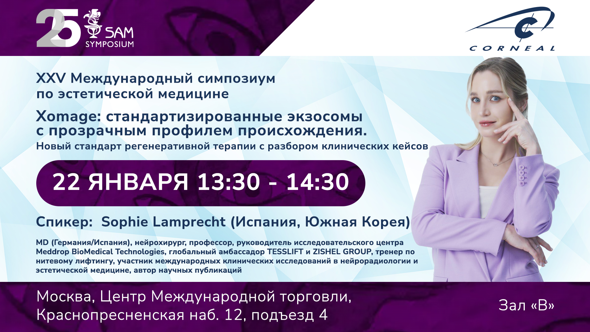 Спешим сообщить, что компания Corneal участвует в юбилейном XXV Международном симпозиуме по эстетической медицине SAM 2026, который пройдёт 21–23 января 2026 года в Центре Международной торговли (г.Москва, Краснопресненская наб., 12, подъезд 4).